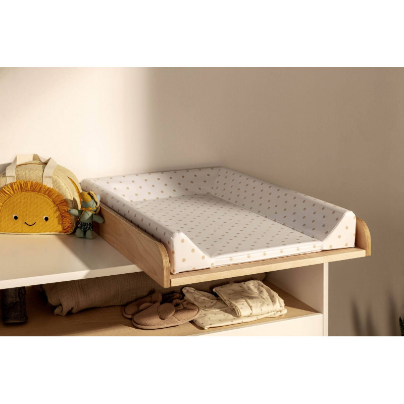 Lleva incorporado un tablero de madera que se sujeta a la cómoda de una forma muy sencilla. Podrás encontrarlo en color madera con tapizado Rabbits o Lunares Beige, o en blanco con tapizado Rabbits, Estrellas Gris o Lunares Beige. ¡Escoge la combinación que más te guste!