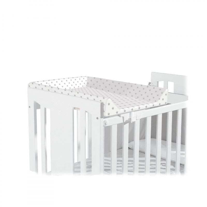 Este cambiador de cuna incluye tapizado de plástico de fácil limpieza, disponible en dos estampados: Estrellas gris y Lunares beige.