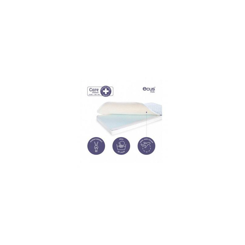 El colchón de cuna Care Ultimate tiene una cremallera perimetral que divide en dos partes el colchón: la base (de color blanco) y el topper (de tejido azul con zonas blancas). Este diseño facilita su limpieza y mantenimiento, a la vez que proporciona un doble uso al colchón.
