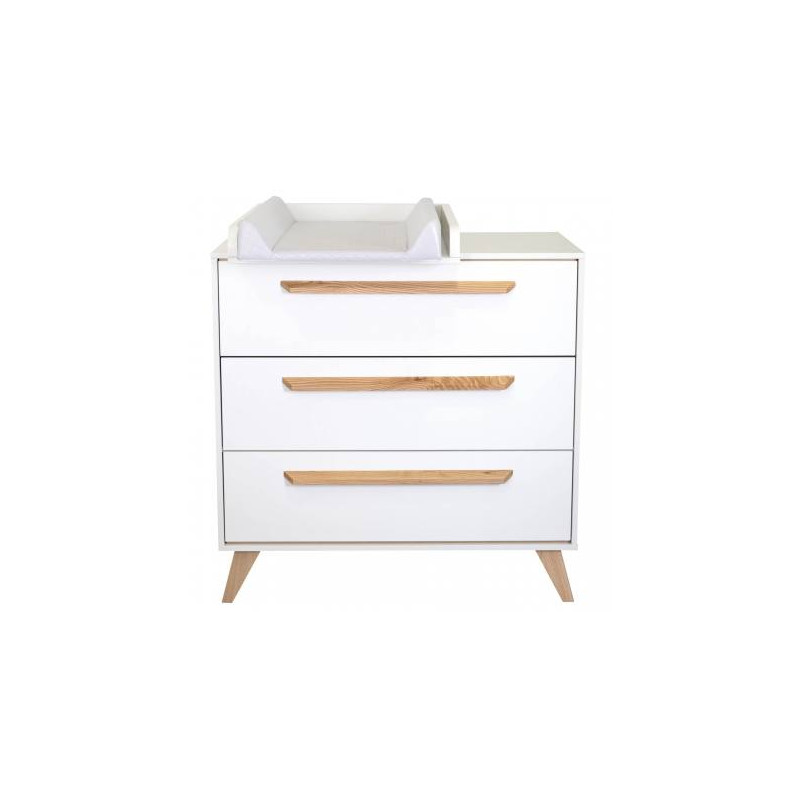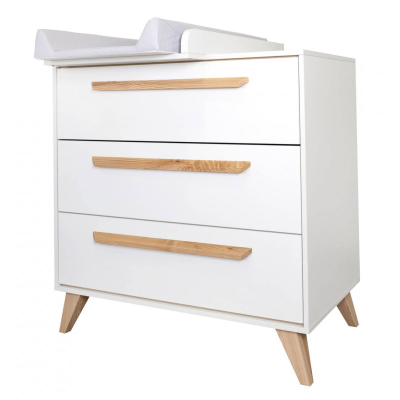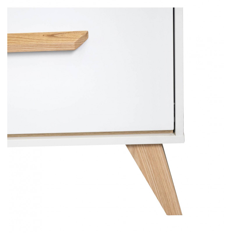 Las patas y los tiradores son del color de la madera natural, mientras que el resto del mueble es en blanco.