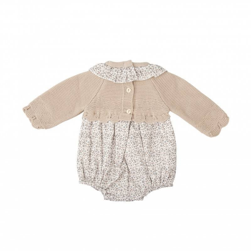 Precioso conjunto de dos piezas compuesto por jersey de punto con detalle calado en el delantero y braguita de algodón estampada. El cuello bebé, a juego con la braguita, le aporta un aire dulce y natural.